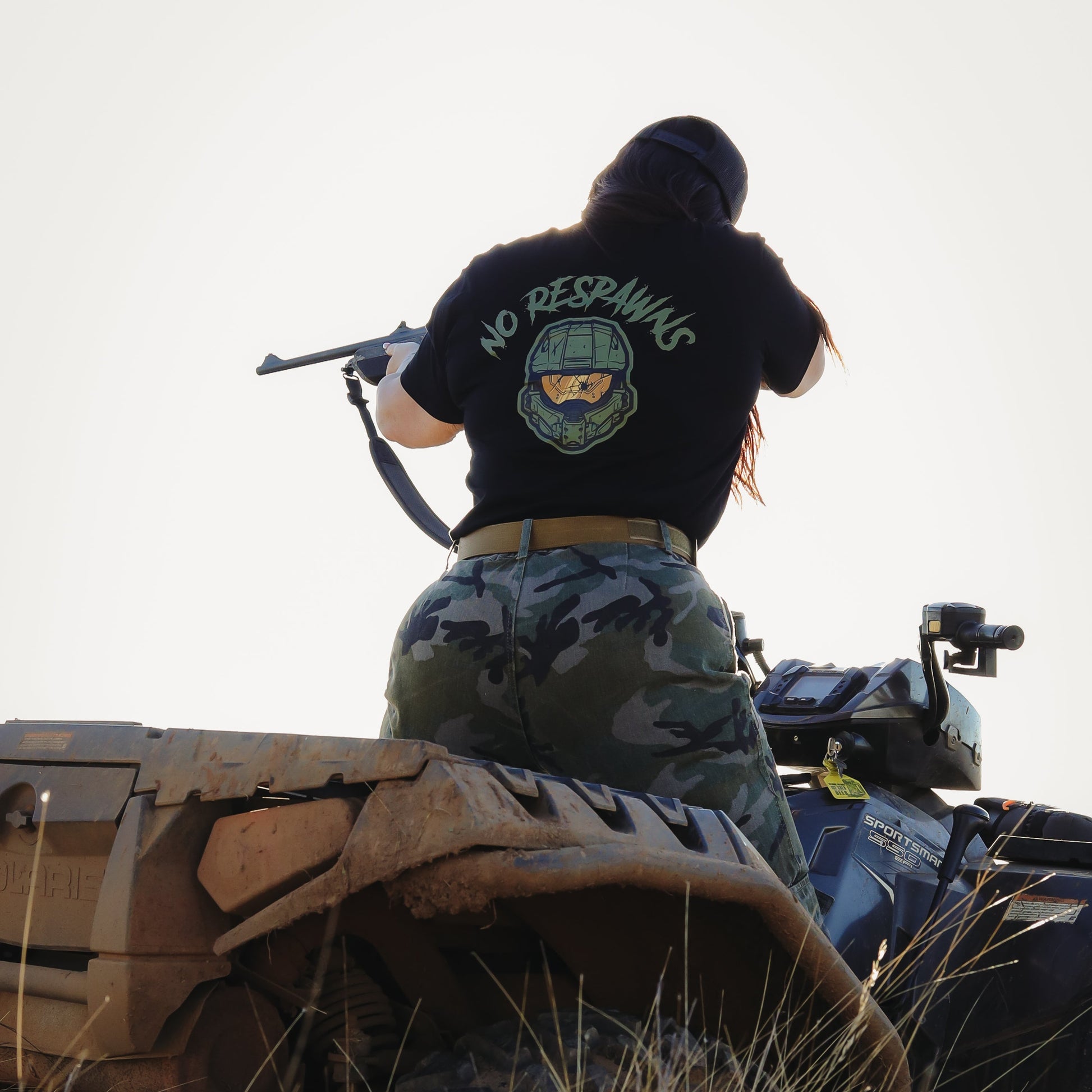 Inspired by a real-world sign spotted in a Forward Operating Base during the Global War on Terror — and echoed in the brutal finality of Halo’s battlefield. This design is a stark reminder: some missions don’t come with second chances.